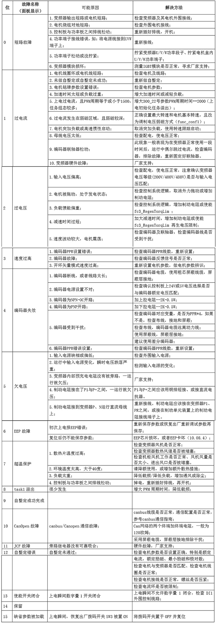下表為“報警標志位變量”的故障代碼信息與故障的解決方法: