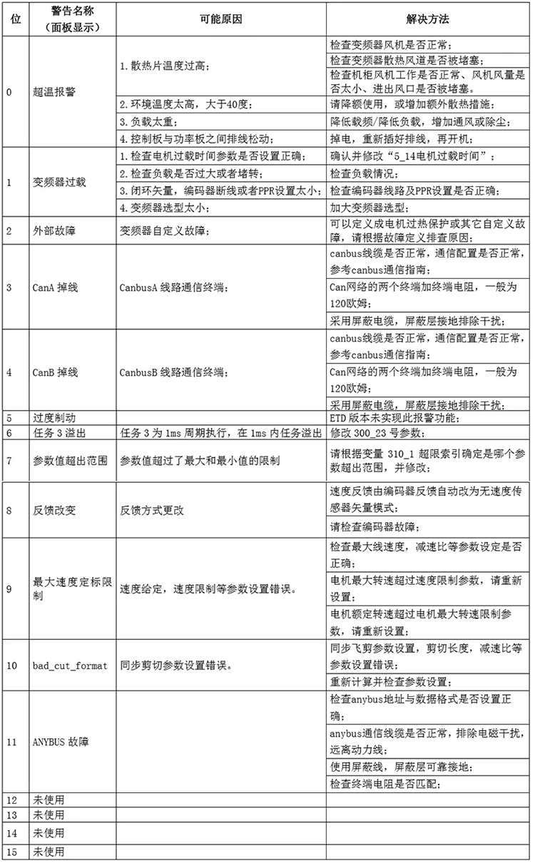 警告代碼是一16位二進制數字量,名稱為報警標志位變量,每位代表一個故障,0代表無故障,1代表有故障。