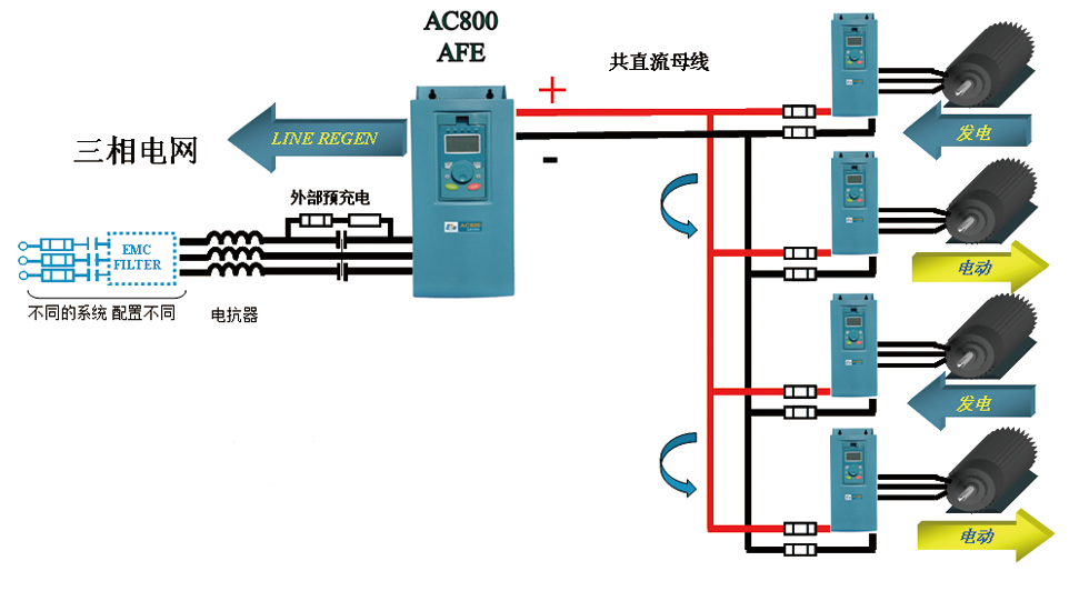 ? 能量回饋電網(wǎng):系統(tǒng)中電機(jī)發(fā)電狀態(tài)產(chǎn)生的再生能量可以通過(guò)直流母線反饋被其他工作在電動(dòng)狀態(tài)的電機(jī)消耗掉,動(dòng)力不足部分由整流單元提供。如果需要解決急降速所產(chǎn)生的過(guò)大再生能量無(wú)法吸收問(wèn)題,可以增加一套共用的制動(dòng)裝置,或者選用AFE母線單元,能量直接回饋電網(wǎng)。