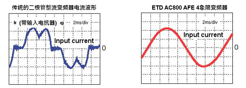 無(wú)論何種負(fù)載,ETD AFE變頻器保證輸入電流和電壓同相位,是真正的“單位功率因數(shù)”逆變器。