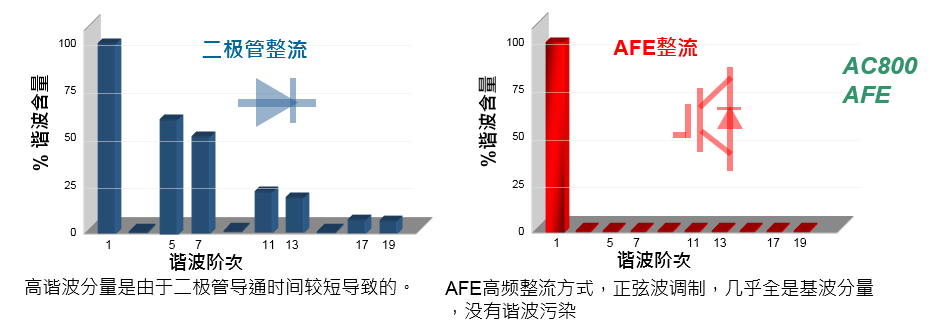 AFE有源前端AC800,可靠,功率因數(shù)為1,零諧波,能量可以直接回饋電網(wǎng)。成本最高,但是可以為終端用戶(hù)節(jié)約用電成本。